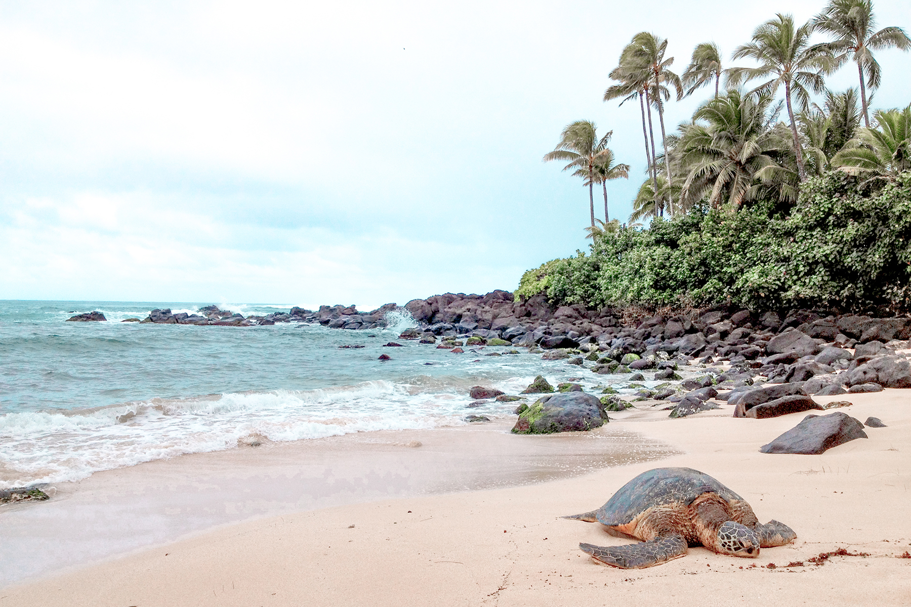 “Stay behind the rope” said the woman. Behind her chills a sea turtle the size of a toddler. It all feels like a dream, are turtles really this big? I start thinking about their connection to the dinosaurs. I can see the resemblance. Laniakea Beach is a small bay where sea turtles come to sunbathe and eat. Volunteers put down red ropes so the visitors keep their distance – this is turtle territory and not ours to stomp as we wish. The palm-shaded beach on the northwestern coast of Oahu is a natural stop on the way to the famous North Shore.